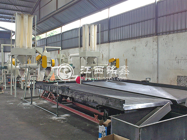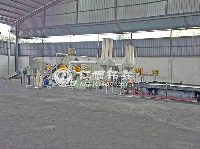 MX600型智能破碎機(jī)進(jìn)行粗破 ---> 皮帶機(jī)輸送(磁選機(jī)除鐵) ---> MX500型干式銅米機(jī)細(xì)破(可加除塵系統(tǒng)) ---> MX1200型干式分選機(jī)分選出(粗、中、細(xì)銅米) ---> 風(fēng)壓吸塑機(jī)將塑料(包含雜質(zhì)和毛絲銅粉塵等)吸入聚料斗中 ----> 專用螺旋輸送 ---> 專用水選床水選