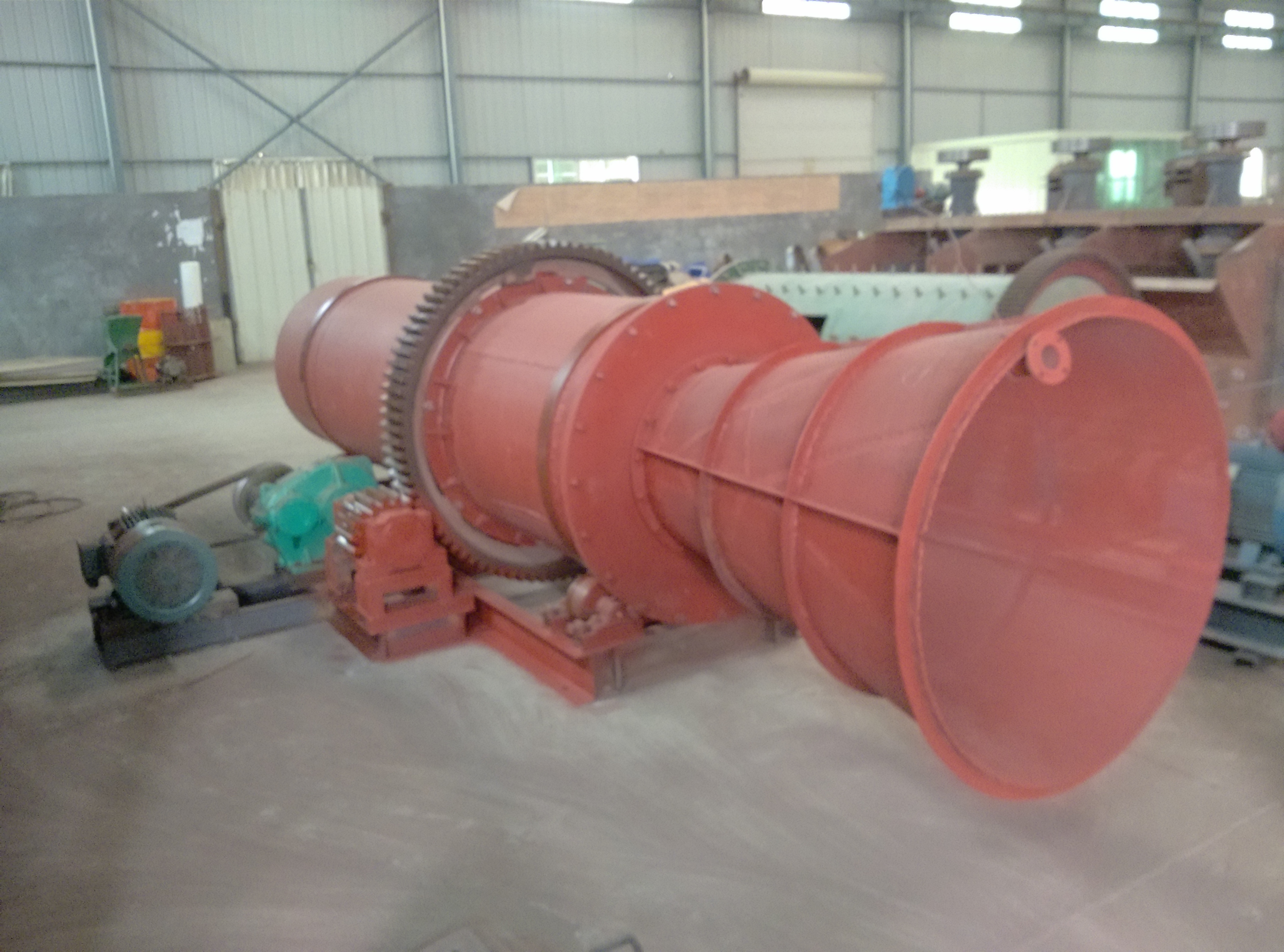 圓筒洗礦機(jī)工作同體用四個(gè)滾輪支撐,電機(jī)帶動(dòng)減速器,大小齒輪使工作筒體低速旋轉(zhuǎn)。含有泥雜質(zhì)的礦石物料從進(jìn)料口給入,進(jìn)入旋轉(zhuǎn)的工作筒體內(nèi),被工作筒體內(nèi)安裝有一定角度導(dǎo)料板不斷帶起拋落,自進(jìn)料端到出料端移動(dòng)過(guò)程中多次循環(huán),并被逆向沖洗水流沖涮洗滌。沖洗干凈的礦石物料經(jīng)提升器提升卸入單層或多層錐形篩,分篩成粗、中、細(xì)三個(gè)粒級(jí)分別排出,含有污泥雜質(zhì)的廢水則通過(guò)給料端檔板流出。